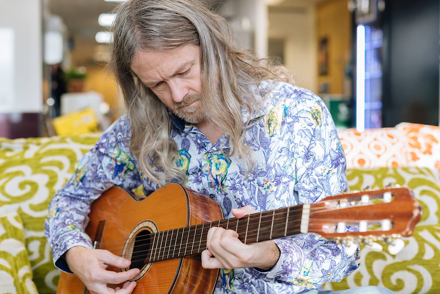 But when he starts talking about his work—the weed-fueled parties with Fable creator Peter Molyneux, the early career struggles sleeping on office floors, the countless times he threatened to resign during Dreams’ development—he lights up. Wearing a button-down shirt with a pattern that defies comprehension, he hugs a Sackboy cuddly toy, and gives the character he helped create a piggyback ride in front of the studio’s wall of awards. He wrestles with a joystick as he shows me a Commodore 64 version of LittleBigPlanet that he’s built in his spare time. He strums chords on a guitar on the airy top floor of Media Molecule’s offices in Guildford, an hour south-west of London, and tells me about his son’s love of gaming—“he’s just addicted to bloody Fortnite at the moment”—over table tennis.